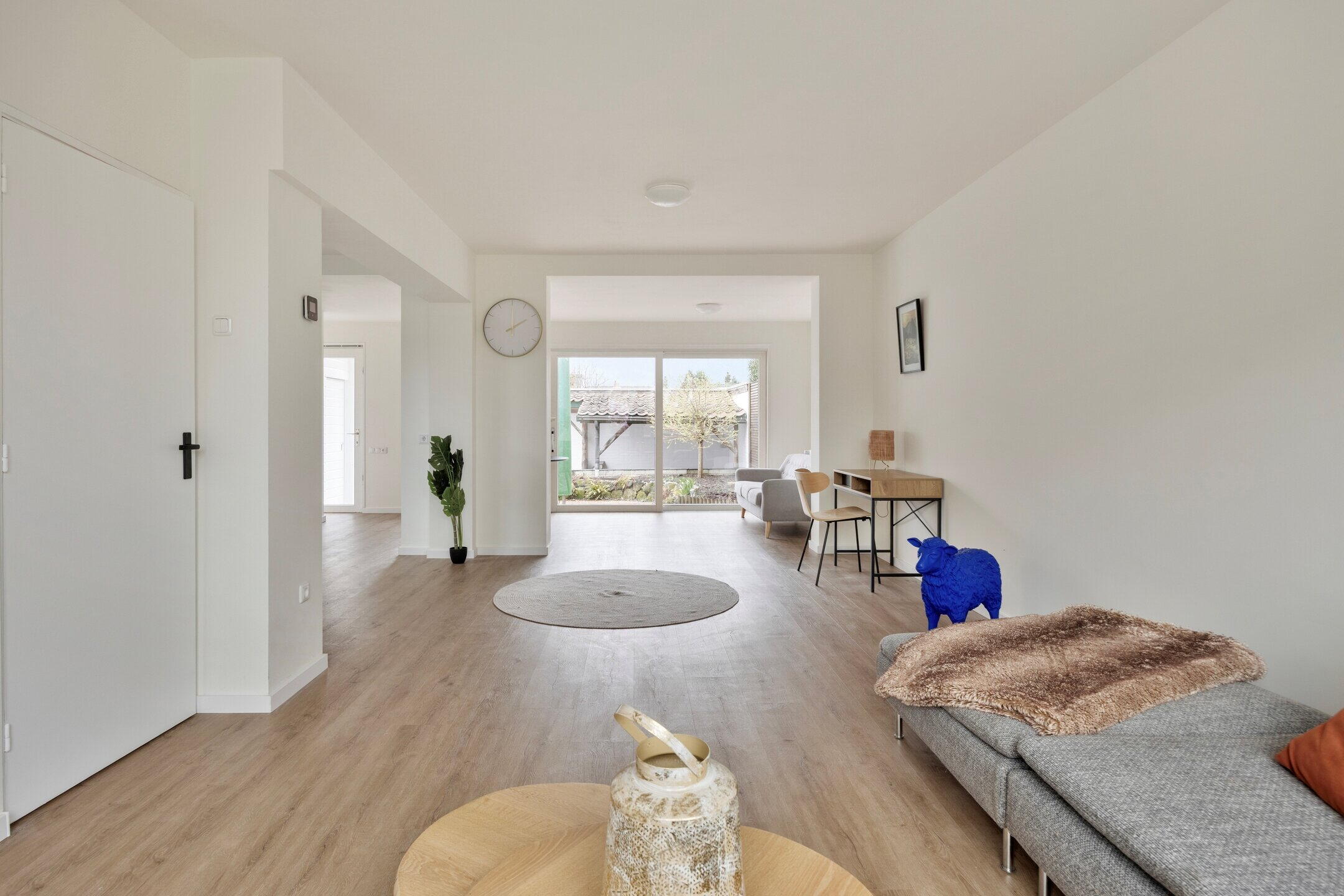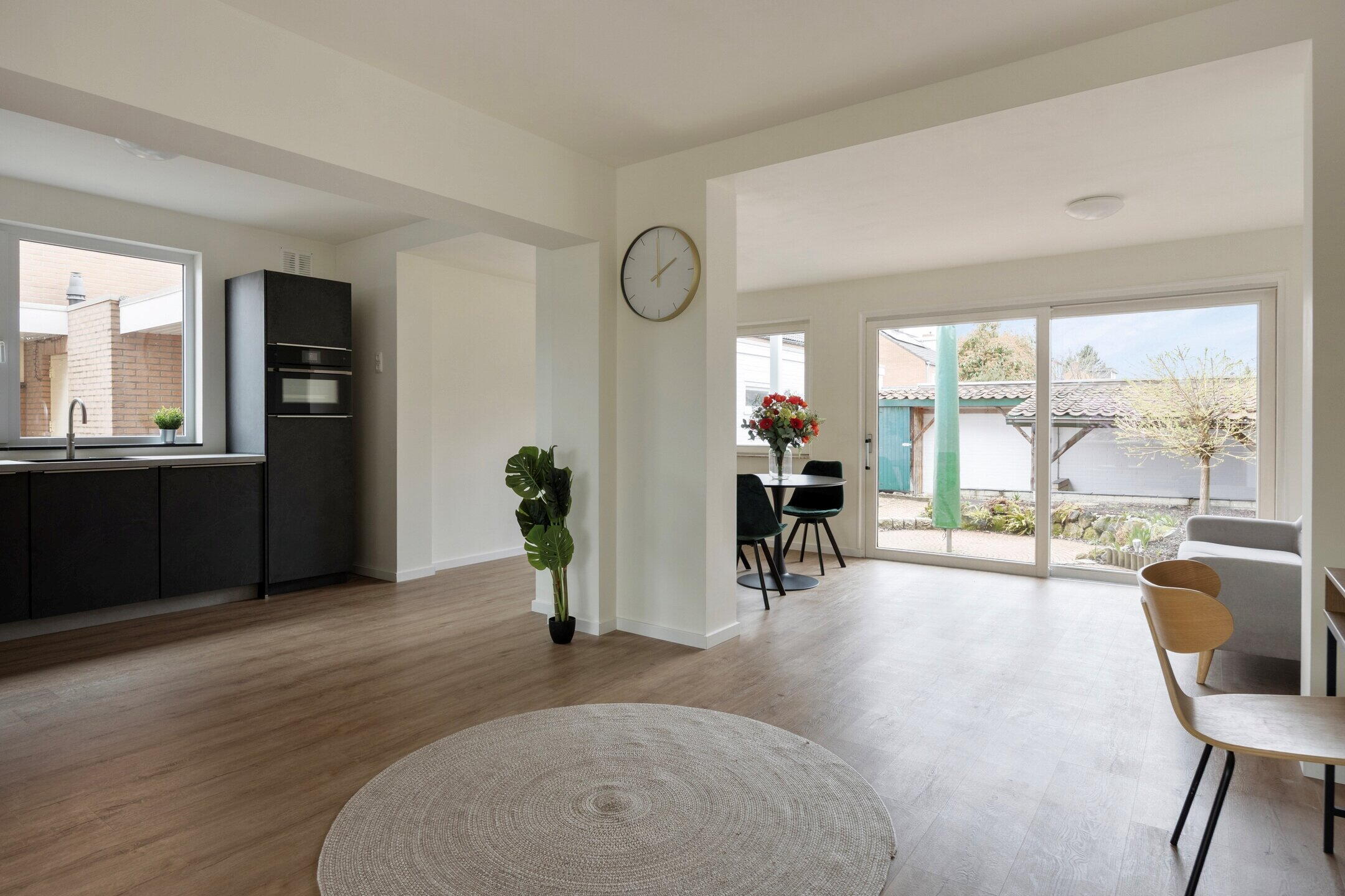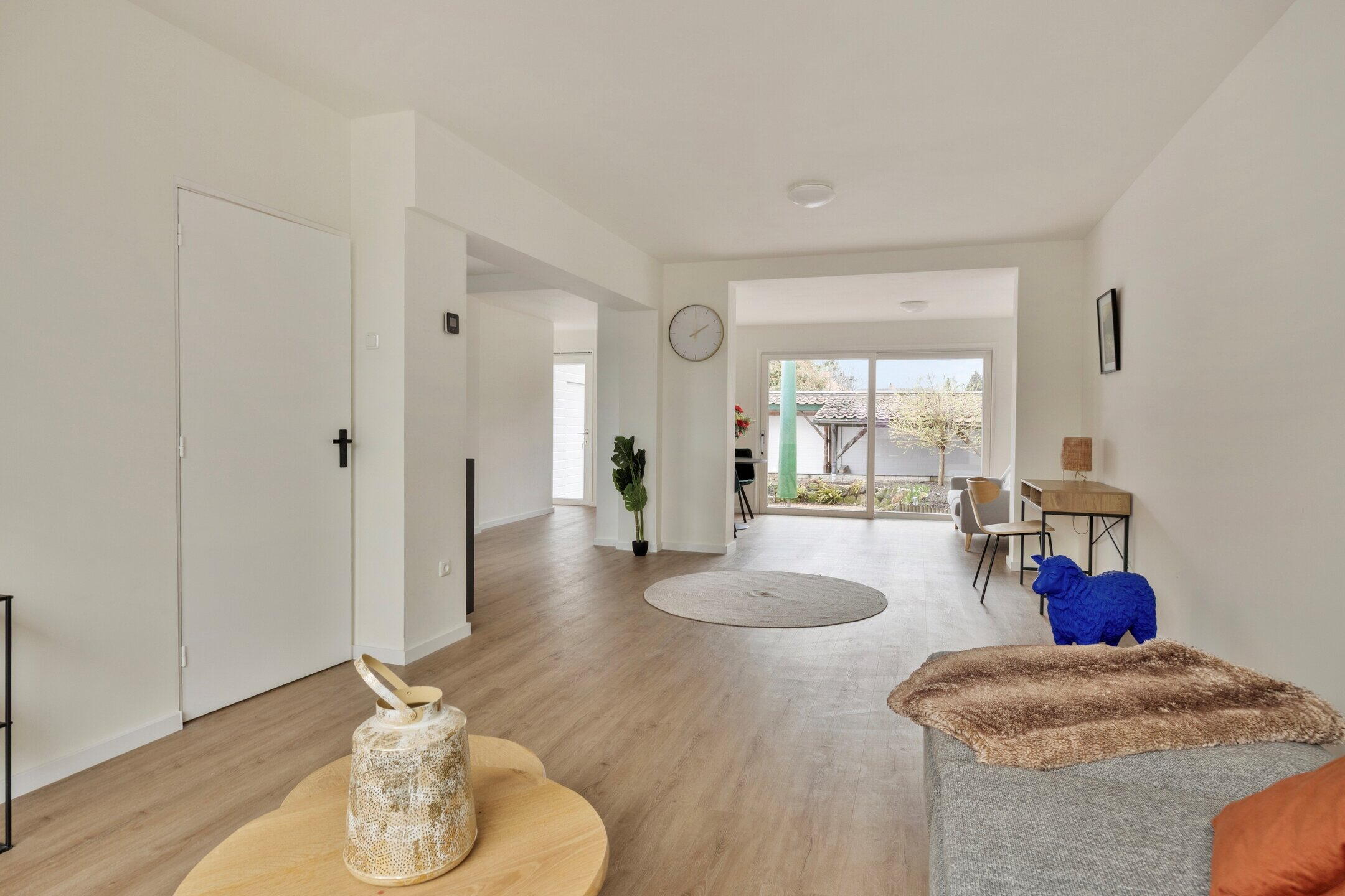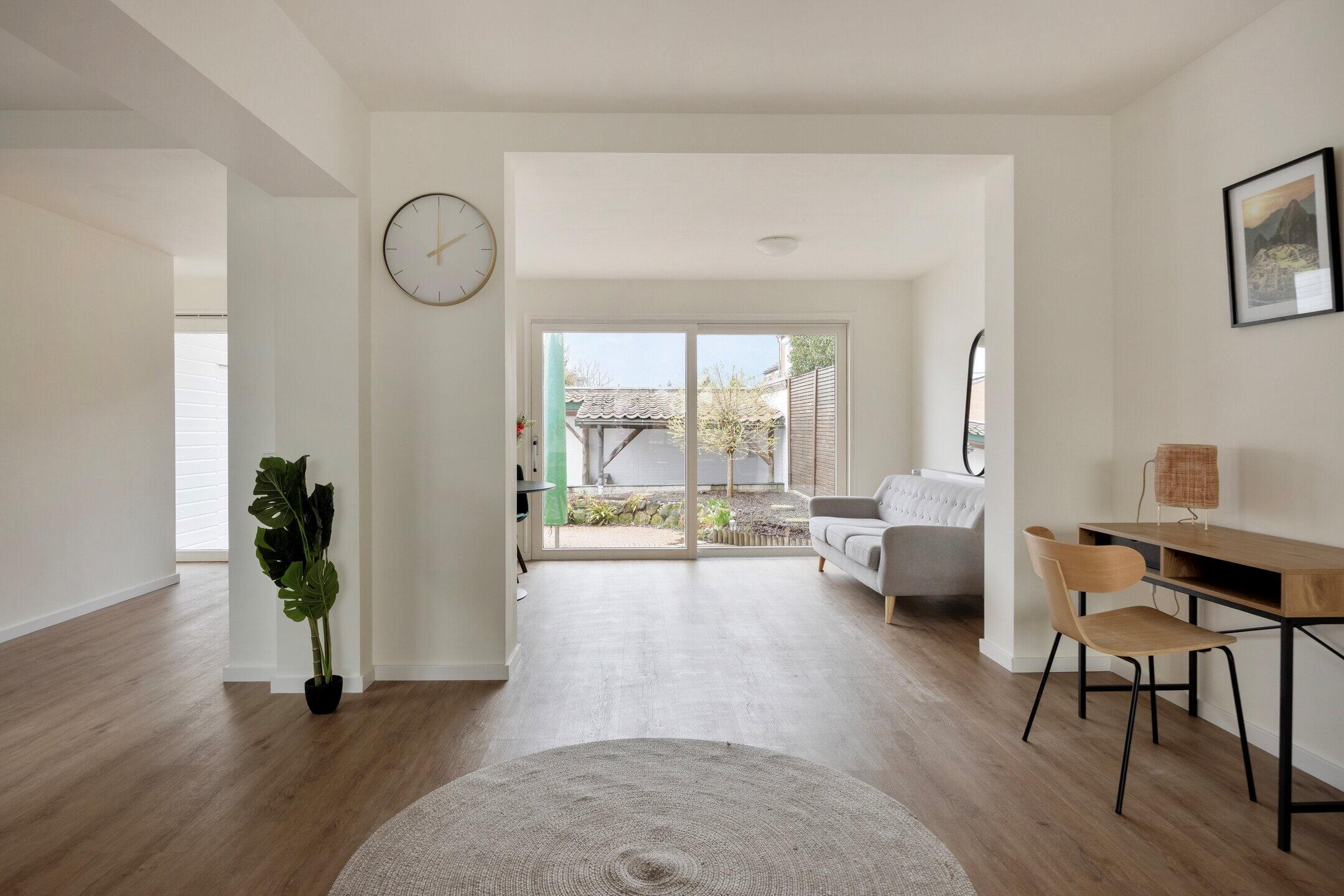 De hal geeft toegang tot de ruime en lichte woonkamer met open keuken. Dankzij de grote raampartijen en de schuifpui naar de tuin valt hier veel natuurlijk licht naar binnen, wat zorgt voor een prettige en open sfeer.