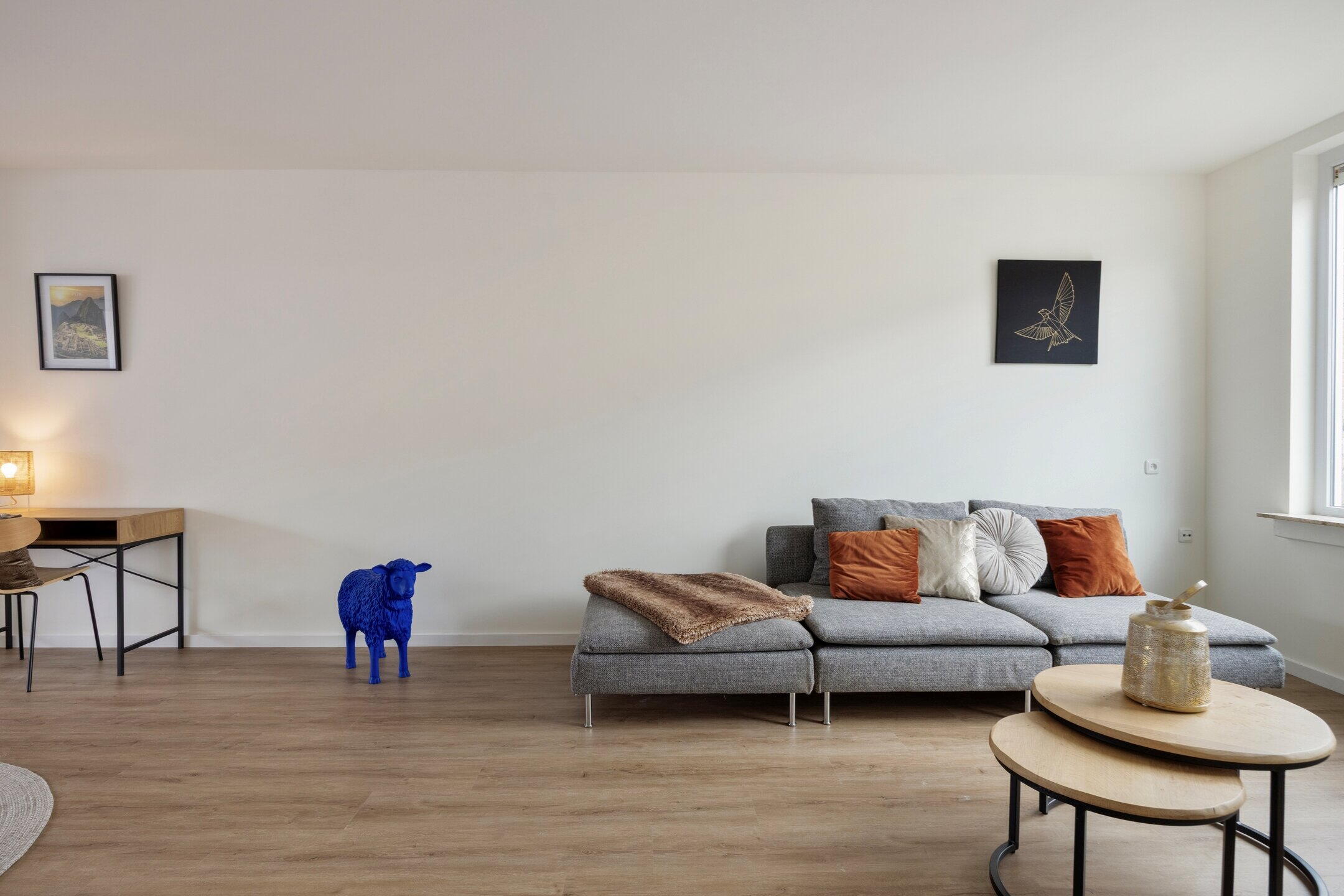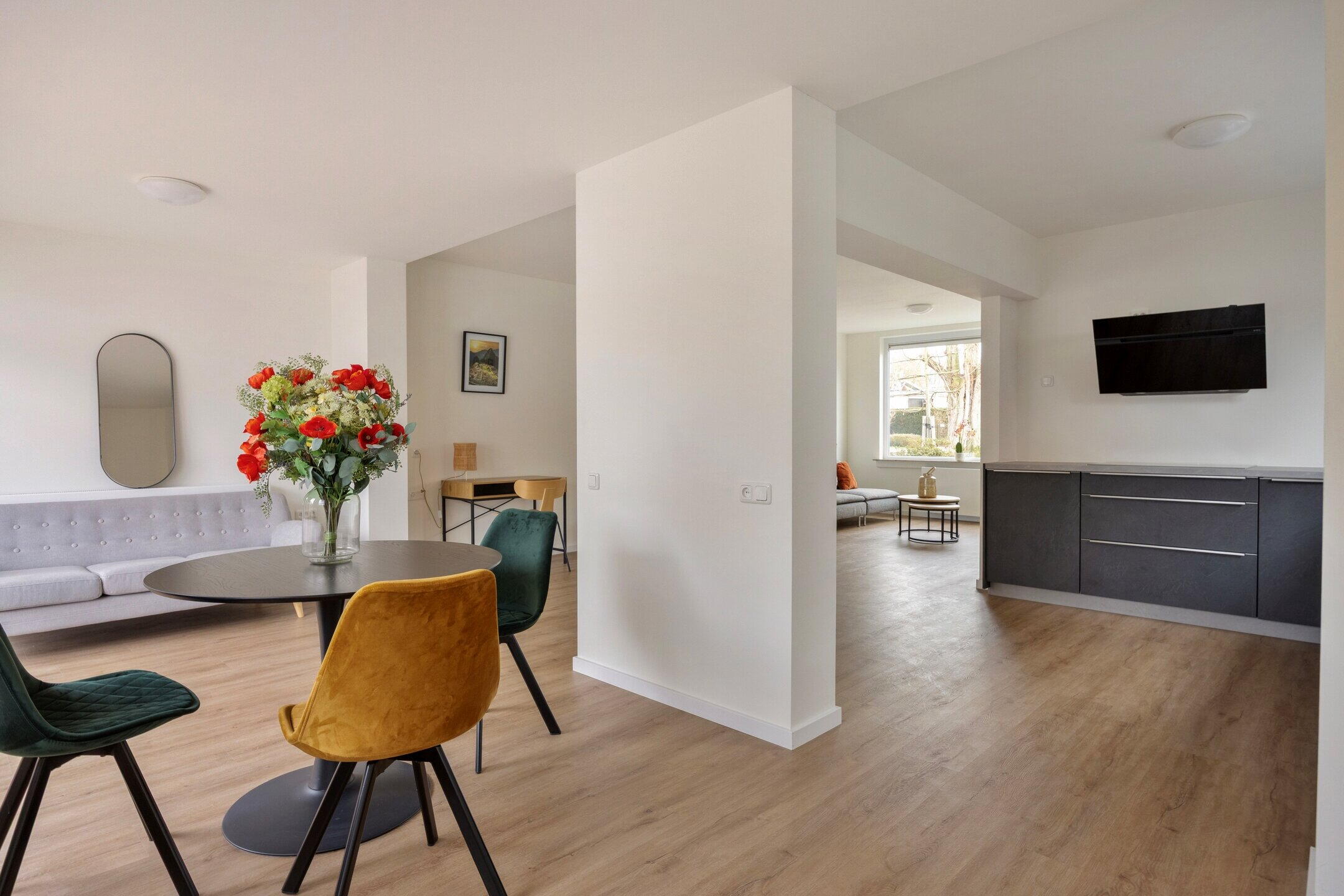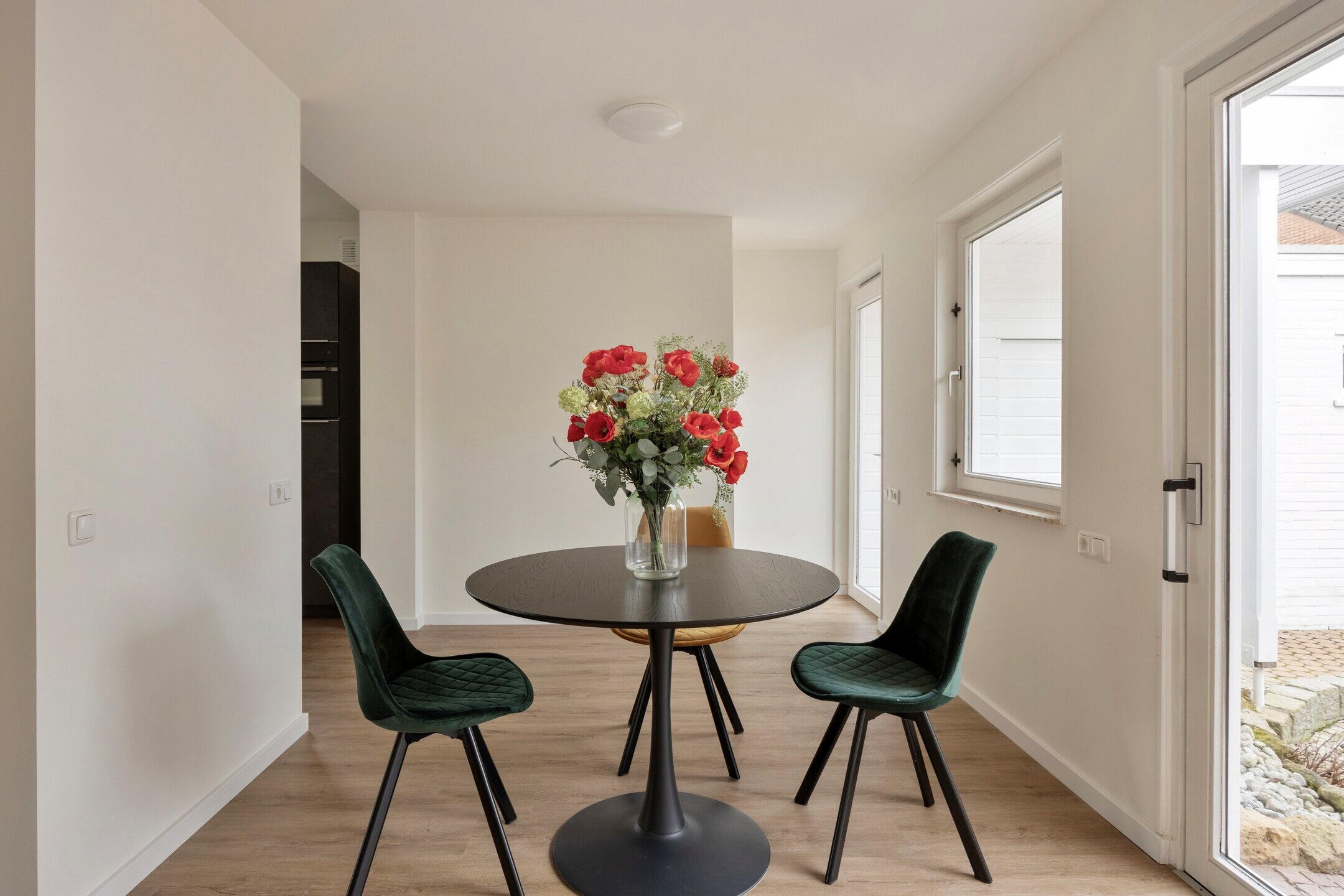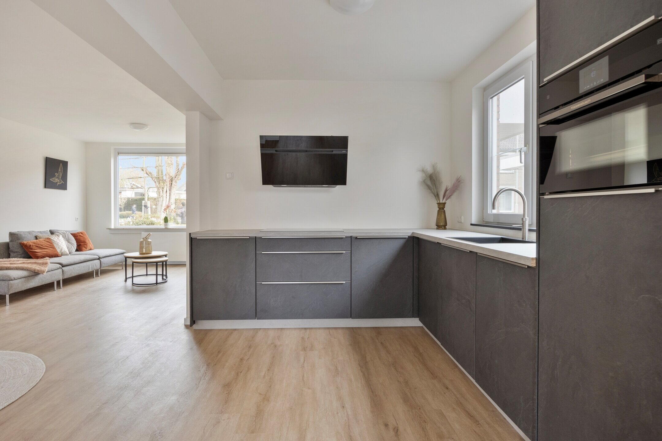 De hal geeft toegang tot de ruime en lichte woonkamer met open keuken. Dankzij de grote raampartijen en de schuifpui naar de tuin valt hier veel natuurlijk licht naar binnen, wat zorgt voor een prettige en open sfeer.