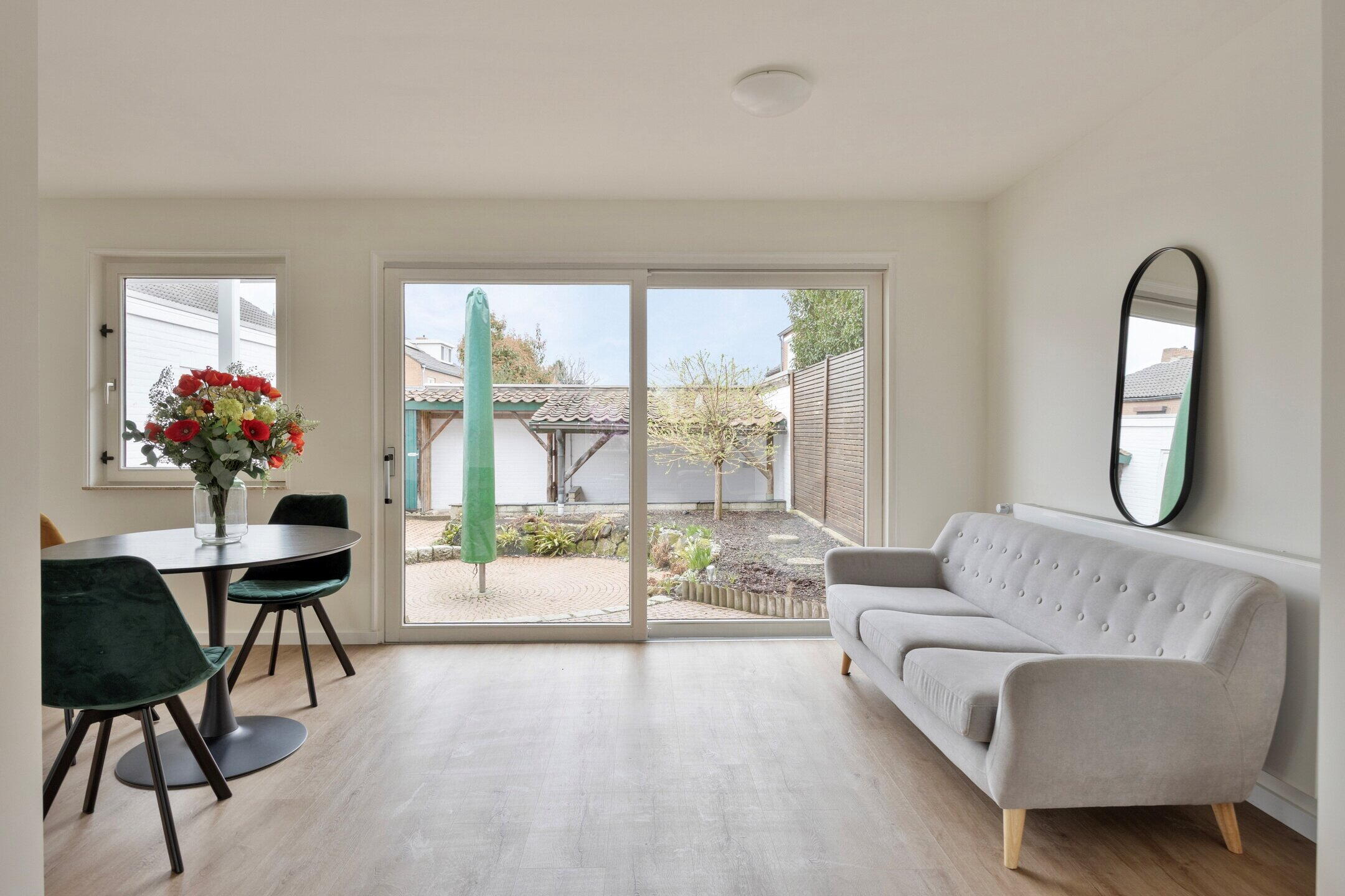 Via de schuifpui en achterdeur stap je direct de achtertuin in, waardoor binnen en buiten op een natuurlijke manier in elkaar overlopen.