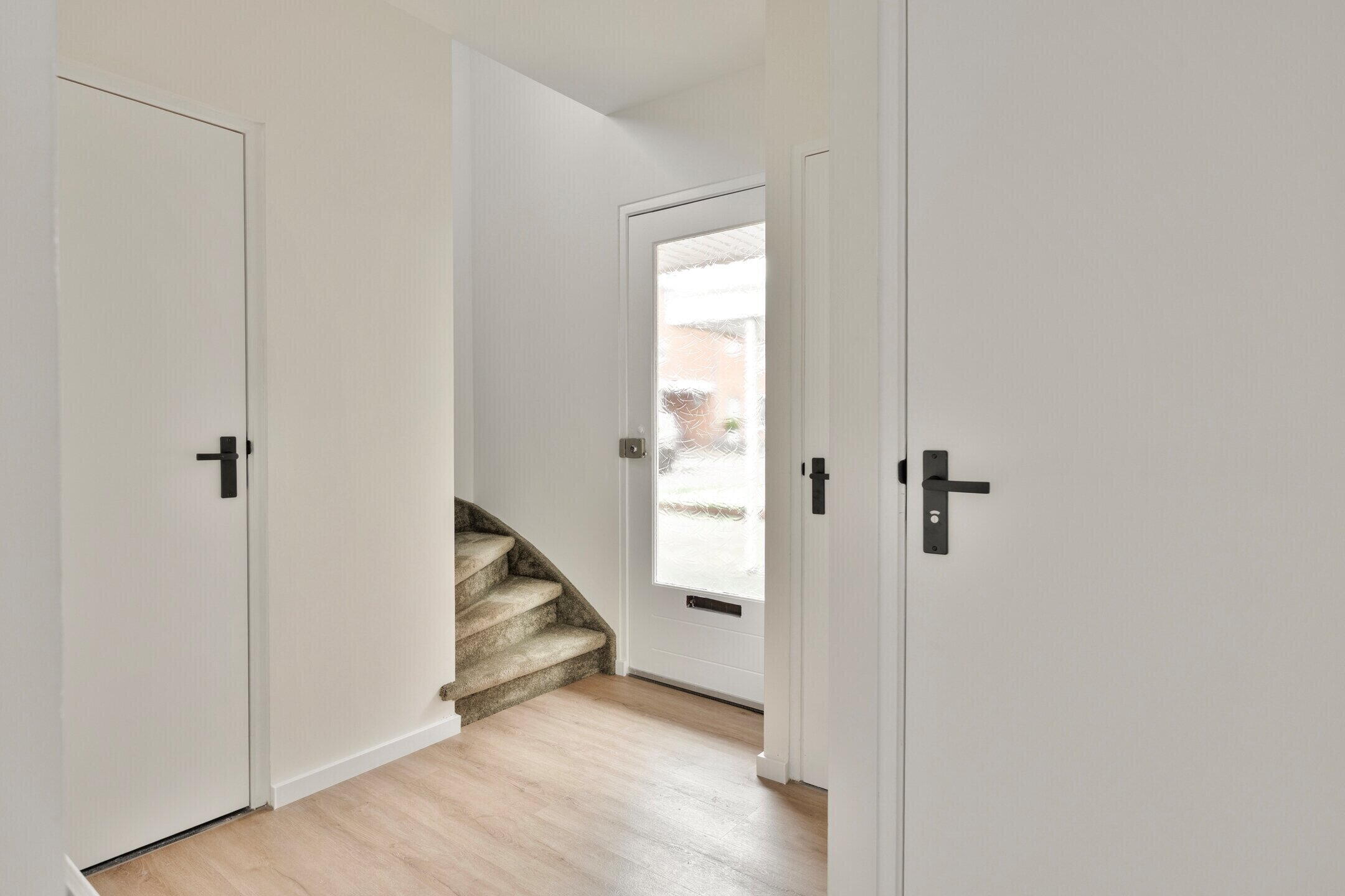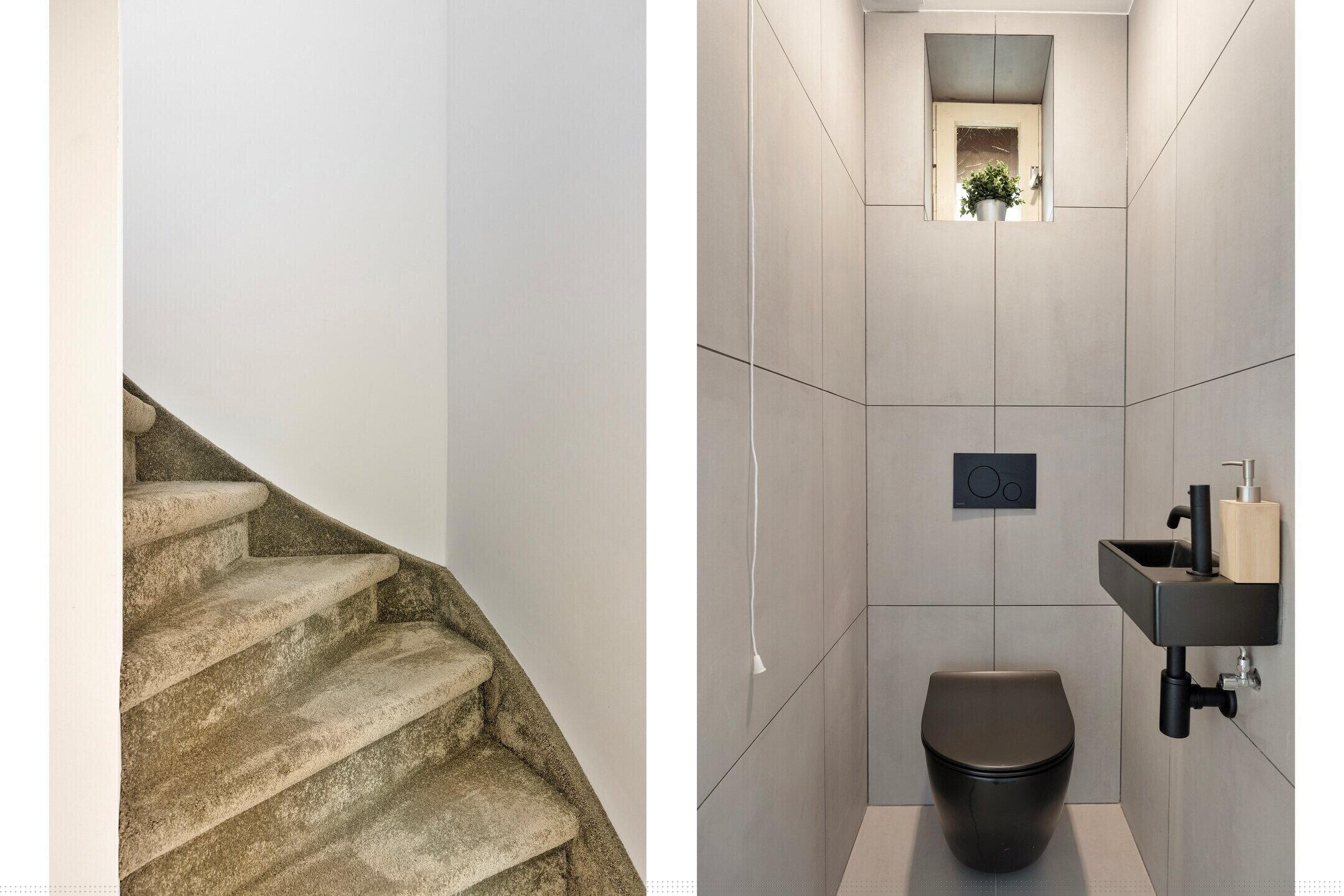 Via de entree betreed je de woning in een nette hal met toegang tot de meterkast, trapopgang naar de eerste verdieping en een modern afgewerkt zwevend toilet met fontein. Onder de trap bevindt zich bovendien een praktische bergkast.