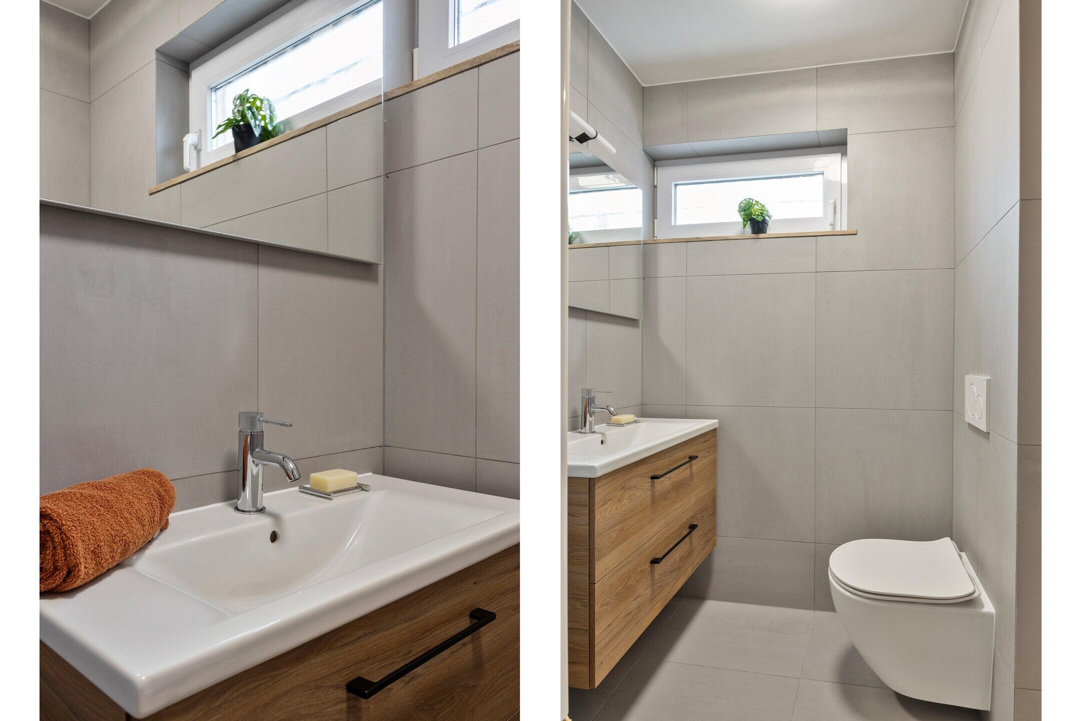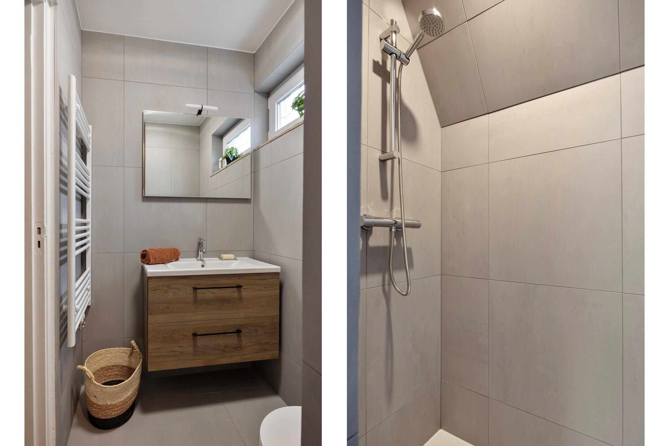 De badkamer is modern uitgevoerd en volledig betegeld met grote tegels, wat zorgt voor een rustige en luxe uitstraling. De ruimte is voorzien van een stijlvol wastafelmeubel, een comfortabele inloopdouche en een designradiator. Hierdoor is het een praktische en aangename plek om de dag te beginnen of juist ontspannen af te sluiten.